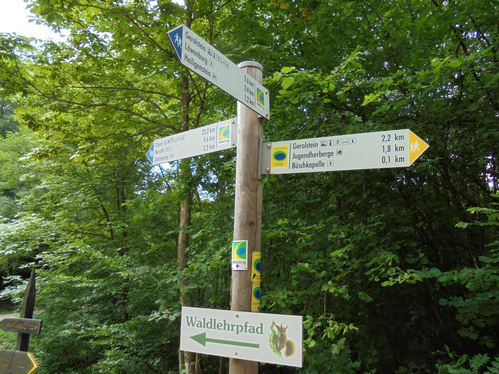 | Een hele reeks wandelingen beginnen aan het voormalige Caluna hotel, nu het Löwestein hotel. Je kan er met gemak parkeren en er is een groot plan waar je kan kiezen uit diverse wandelingen, korte, middellange of lange routes. (Kijk ook onder het tabblad Foto's, daar vind je het wandelplan). Allemaal netjes met kleuren aangegeven, voor de liefhebbers is er een kort leerwandelpad, waar je meer te weten komt over dieren en planten die je daar kan aantreffen. Een eindje verder in het bos (1 km) kom je de Bushkapel tegen, deze is vrij te betreden, je kan er een kaars aansteken, maar ook met de klok luiden. Van daaruit splitsen de meeste routes en moet je een keuze maken. | ![]() |